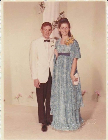 But Mom was undeterred, so we drove to Des Moines to a fabric store, where we still could not find the exact fabric. What a disappointment! So, we compromised and made it with a blue watercolor kind of floral voile. Not really sophisticated, dag nab it, but it turned out fine because Mom did a great job. When we danced at the prom my date held me by the forearm instead of my hand and we sat around the tables being uncomfortable. We were working on the night moves and no one told us how to do it.