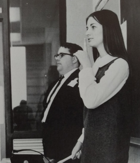 After I was invited to the prom I saw a picture of Mia Farrow in Look magazine in what I thought was the most beautiful gown. I decided that I had to have it. I begged Mom to make it for me, and she agreed. Mia’s dress was a black and white striped voile, and it was stunning. We looked and looked around Marshalltown and couldn’t find anything even remotely like it.