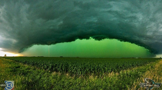 The green indicates that there is a lot of hail in the cloud. Hail reflects back green on the light spectrum. So, sorry, corn plants. You are about to be shredded. This is a really intense green so I think the photo was a bit doctored.