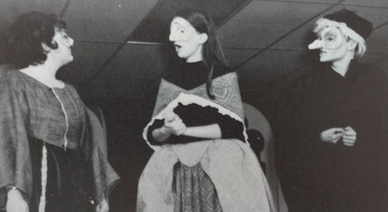 What a character Stan is! He has the most expressive face on the planet, and I can still see him making a surprised look to demonstrate some concept he has. He makes it a blast to be part of the troupe. He yells and fumes and the actors and stage crew cower but eventually it all turns out and he lets us know that we did good. I play Isabella, a female innamorata, and we make masks out of a rubber substance to be authentic. We dress in period costumes that we’ve made ourselves or that the stage moms have made. In Commedia dell’Arte there’s no script. All we have is a loose scenario, so we have to ad lib our lines. The scenarios are from basic Italian stories, and it’s slapstick and a blast. There’s one scene where Ralph, playing the part of Pulcinello is to give me, as Isabella, a big comedic wet one right on the mouth. The comedic part is trying to negotiate the giant noses of our masks. But when Ralph finally makes it to me, he opens his mouth wide, wide open and I, having never been properly kissed have no clue how to kiss back. Allrightey then.