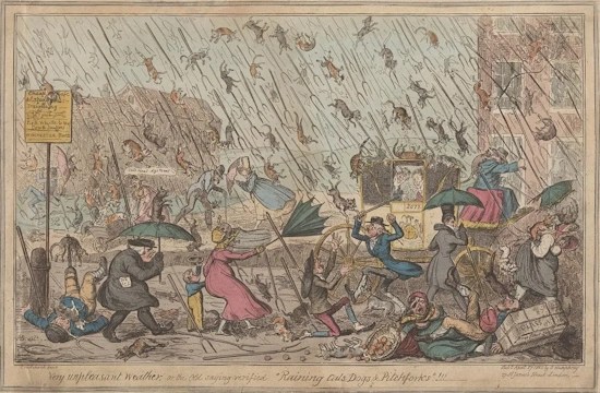 Houses had thatched roofs-thick straw-piled high, with no wood underneath. It was the only place for animals to get warm, so all the cats and other small animals (mice, bugs) lived in the roof. When it rained it became slippery and sometimes the animals would slip and fall off the roof, resulting in the idiom, “It’s raining cats and dogs.”